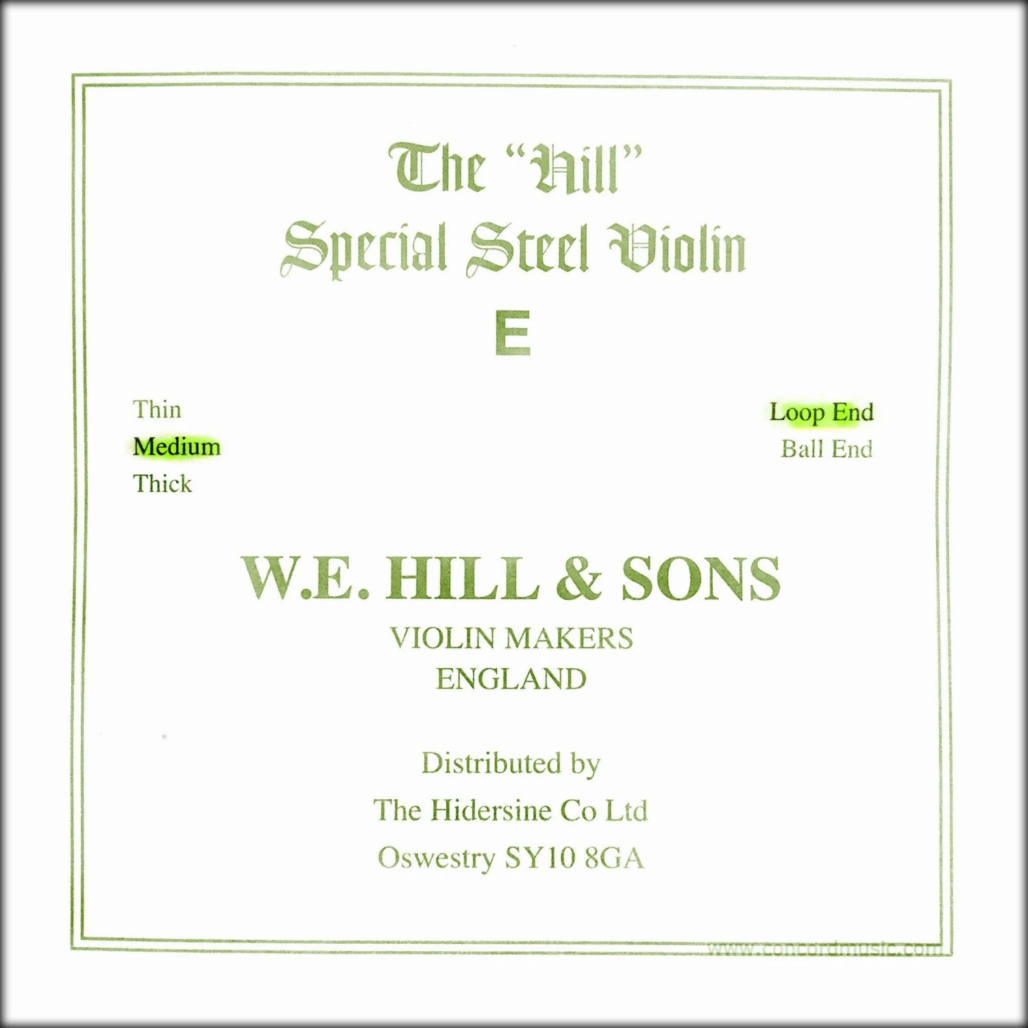 The “Hill” Special Steel Violin E String;Â from W.E. Hill & Sons Violin & Bow Makers, England.
