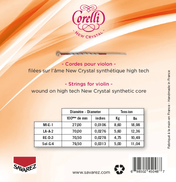 Corelli New Crystal Violin Set –with a new high-tech synthetic core, Corelli New Crystal violin strings offer a warm natural tone and improved sound, volume and projection